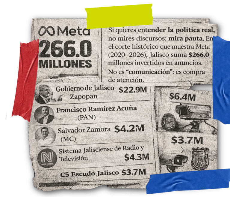 Facebook deja ver lo que el gobierno suele esconder: quién paga para dominar la conversación. En Jalisco, de 2020 a 2026, el Top 10 histórico es casi puro gobierno y políticos.